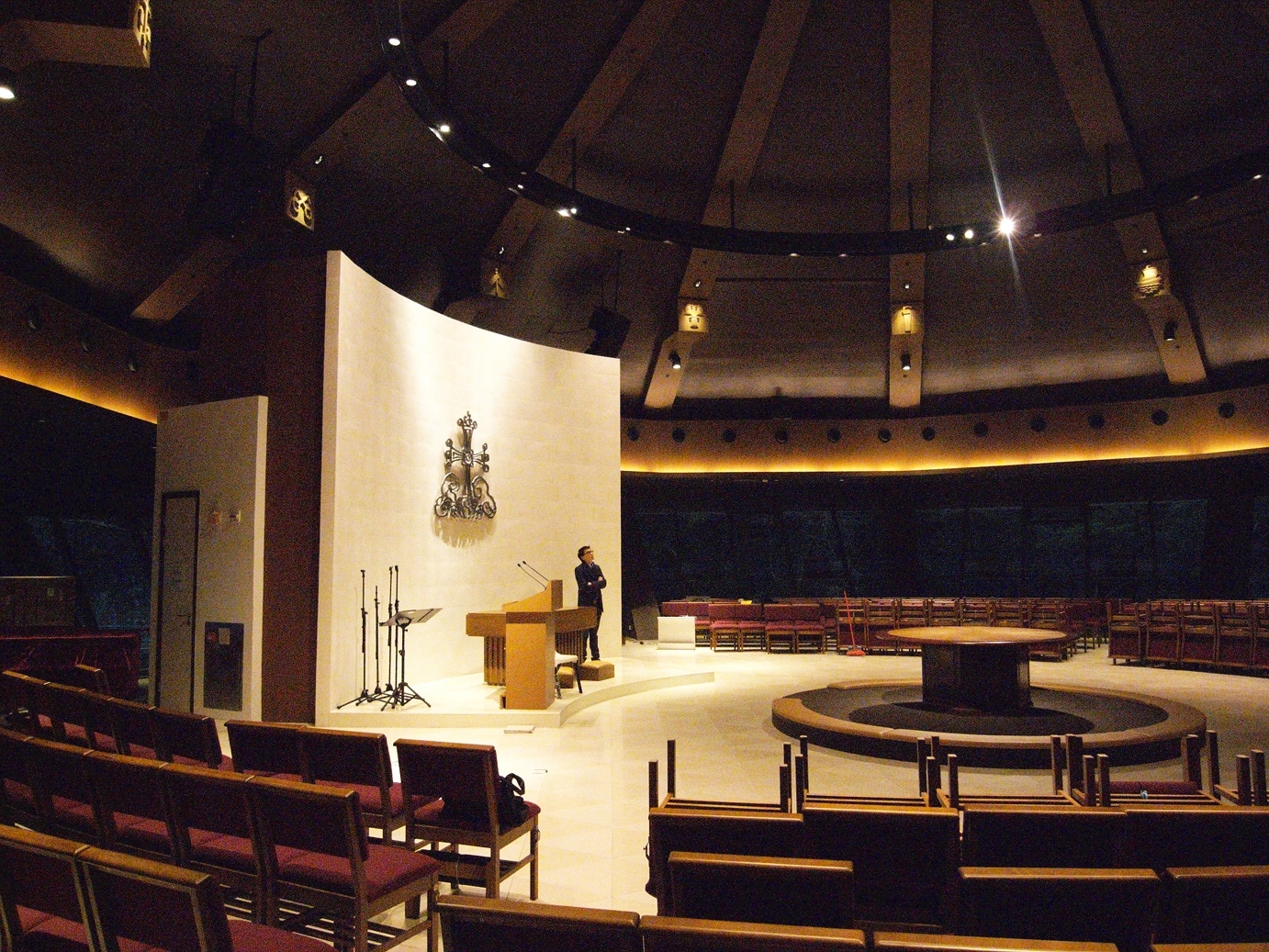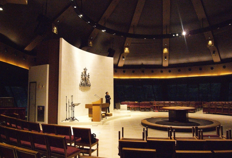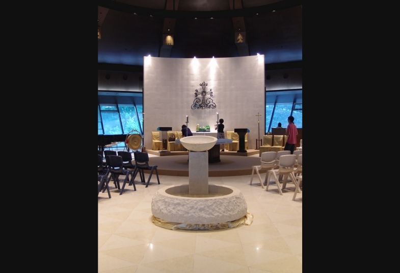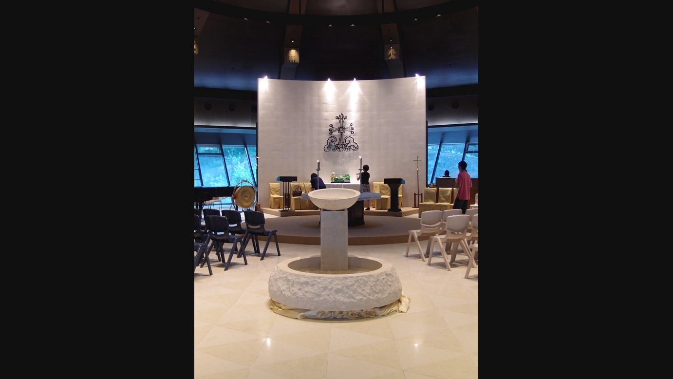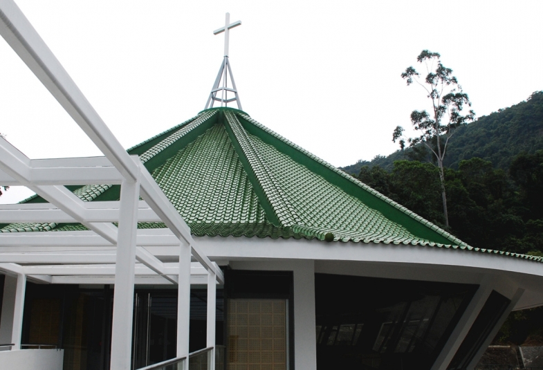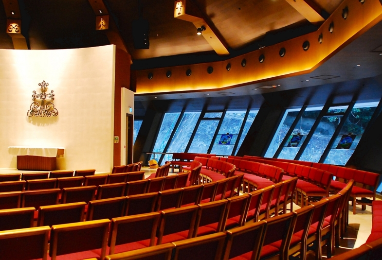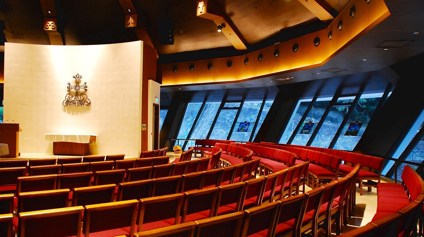 The new church is surrounded by greenery and geographically close tied with nature, interior design in a simple and transparent, so that the surrounding landscape into the building through a lot of glass windows. Triangle tile puzzle of the church ground, symbolizing the Trinity; twelve columns supporting the superstructure within in the church, each pillar are engraved with the symbolic mark of the disciples; on behalf of the Good Friday process 14 Bitter Road Station is drawn in a square foot stained glass, just like a picture hanging in the windows. Around the green water, shade, stained glass from the inside looking out, five denominational flag, the Chinese University of Chung Chi College, two badges, vaguely meanders to the historical role and mission of the Christian Faith Theological Seminary.