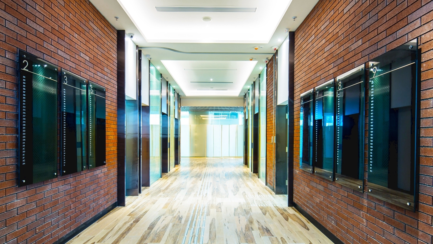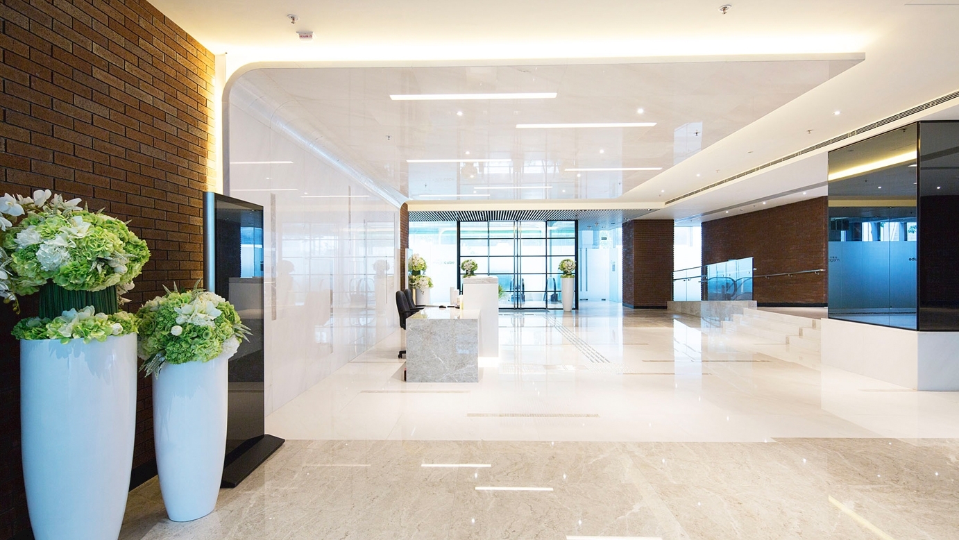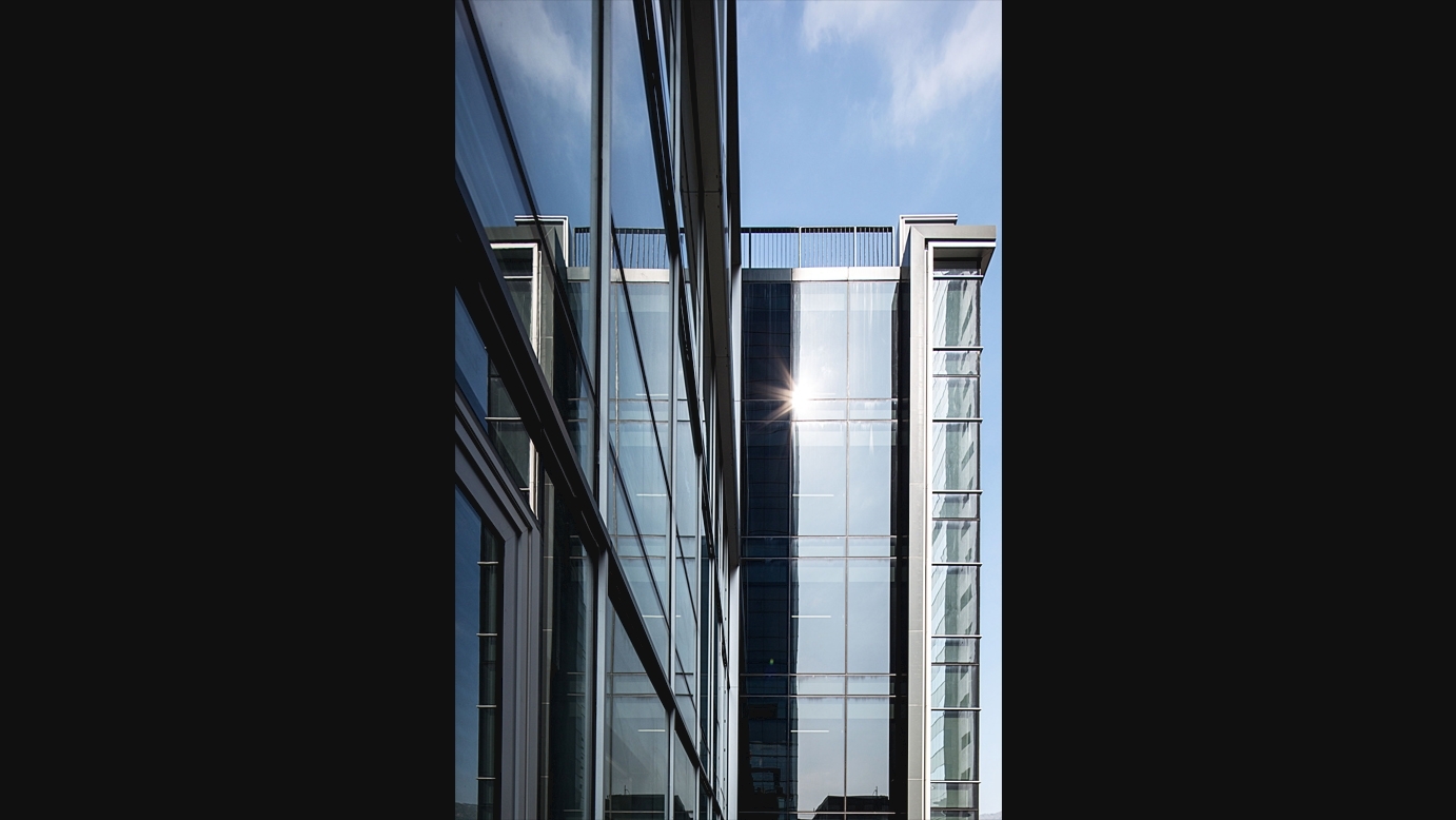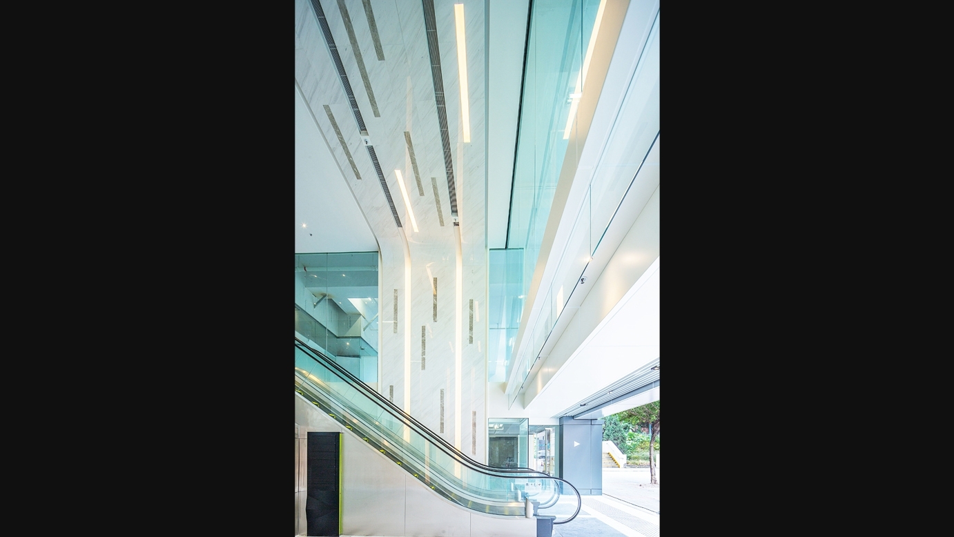 A canopy was designed to wrap around the bottom of the building to define the public (Shops) and private space (Office), as well as providing shelter for pedestrians at street level. Sharp lime colored aluminum panels was applied at the bottom of the canopy; this subtle highlight serves to inject a dose of vibrancy and energy. The canopy at the main entrance section is elevated, that is to highlight the main entrance in order to make it a more welcoming doorway into the building.