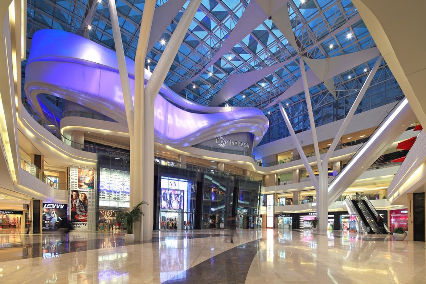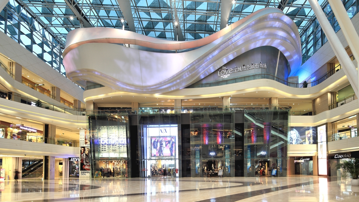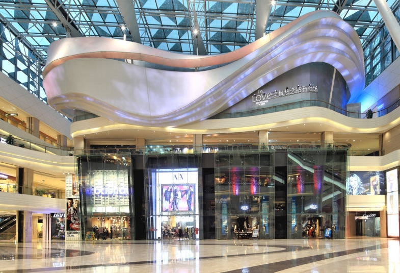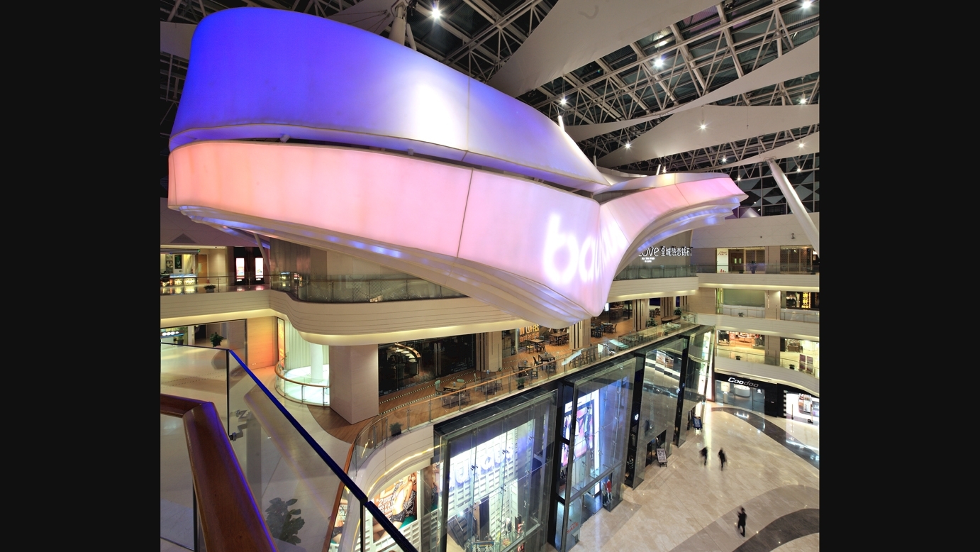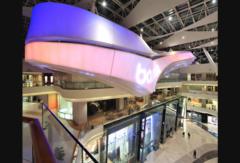 整个商场围绕着中央广场而设计, 成为项目独特亮点; 20多米高的采光天窗 , 日照充足 。跨层扶梯、露天茶座分佈在中庭旁不同角落。最吸引眼球的乃中庭双层店面上南端的主力店设计 , 造型为一个起伏有序、成波浪型的巨型雕塑设计 , 罩以米白色三维拉膜布幕 , 从店内伸展至外 , 横跨整个中庭上空 ; 晚上更添上特殊灯效投影 , 透射到外型不同的位置 , 丰富整个中庭氛围。这亦成为举办大型活动的焦点背景。