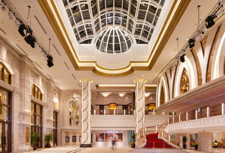整个娱乐广场的室内设计除炳承了银河渡假酒店的高贵与华丽外,亦带着东方味宫廷式的古典优雅。其偌大的室内空间及丰富装饰,配以天幕和流线型的扶梯,作为举办重要的电影活动场地(如首影礼),最为合识。