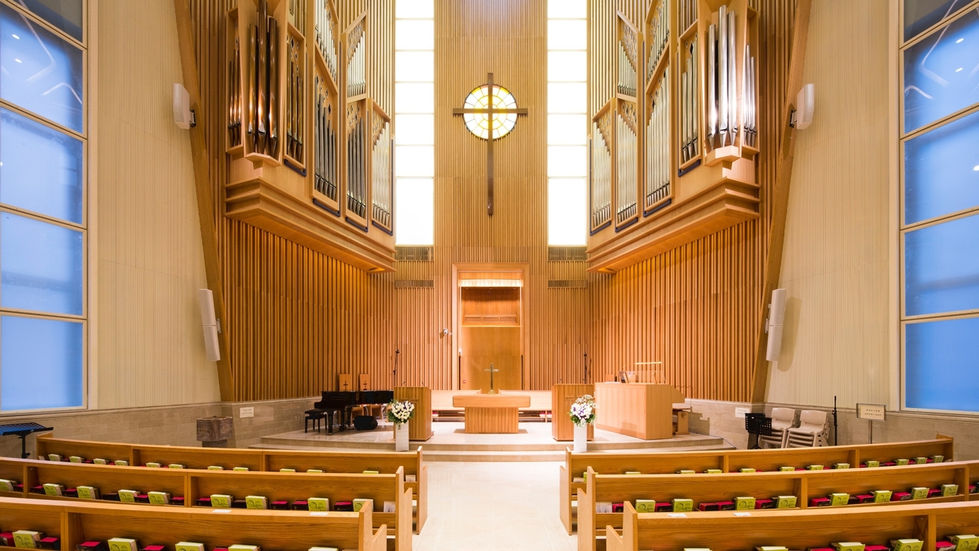 大楼外型象徵「祷告的手」,而正立面更展现「三位一体」的概念。通透的地下大堂吸引途人进入这城市绿洲;独特的结构设计塑造出无柱的圣堂,旋转大楼梯贯穿平台各楼层,让会友体验「朝圣」之旅。