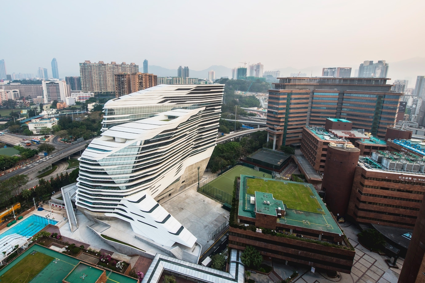 讓講師、學生或訪客穿梭於其中,這種設計旨在促進人與人之間的互動、交流及合作的機會。流線形的中庭設計可引入天然光線及提高空間的連續性,平台與塔樓的一體化設計,將提供各用家及各種設施之間交流及對話的最大可能性。[Photo Credit: Sunny Wong]